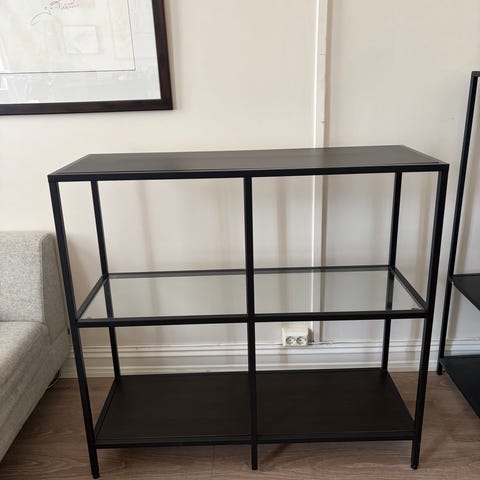 Den må hentes på Konnerud; enkel og lett å bære. Glasshyllen kan løftes av.