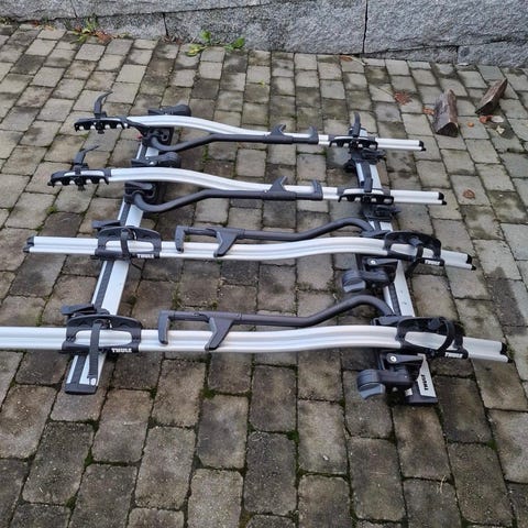 Thule Takmontert sykkelstativ i aluminium med sølvfargede skinner og svarte holdere. Stativet festes på takstativ/takrails og har hjulskinner samt justerbare fester for ramme og hjul. Egnet for transport av sykler på bilens tak, med flere festepunkter for stabil montering. Passer til biler med kompatibelt takstativsystem.