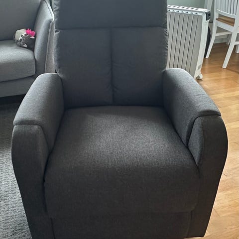 2 stk. Meget velholdte hvilestoler i grått stoff selges.Fotbrett som kan vippes frem. Ikke svingbar.