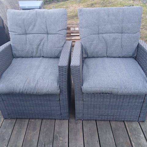 Stolene har et moderne design i kunstrotting med lyse, beige puter som gir både god sittekomfort og et moderne uttrykk. Setter har vært oppbevart innendørs på vinteren.