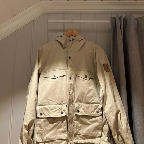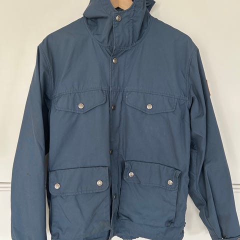 Fjällräven jakke for dame i størrelse S. Jakken er blå og laget i polyester. Den har fast hette.