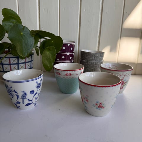4 Bloomingville krus i keramikk med blomsterdekor i ulike farger; 2 grønne og 2 rosa i pastell- og mørke toner med hvitt blomstermønster.