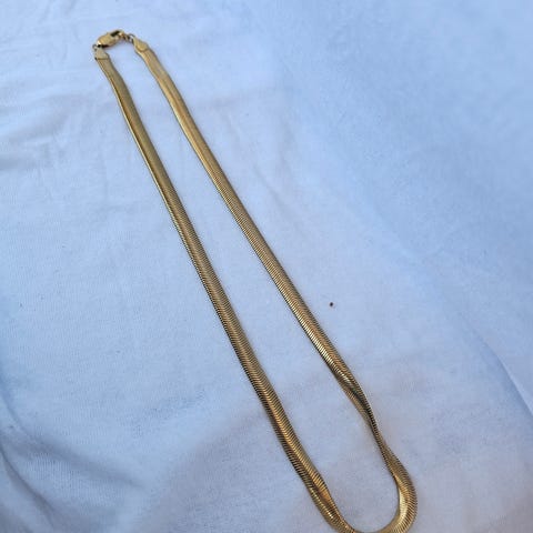 Herringbone Chain Gold fra Edblad (nypris: 449). Blankt 14K gullbelegg på rustfritt stål. Det er nikkeltrygt og vannbestandig. Omtrent 45 cm langt og 3 mm bredt. Jeg har klippet av rundingen med Edblad-logen, men det har ingen betydning for smykket:)