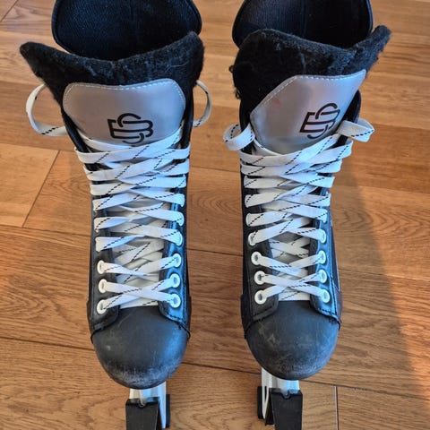Eldre skøyter. Har anslått størrelsen da det ikke står på dem. Funker fint, men hadde sikkert hatt godt av en slip.