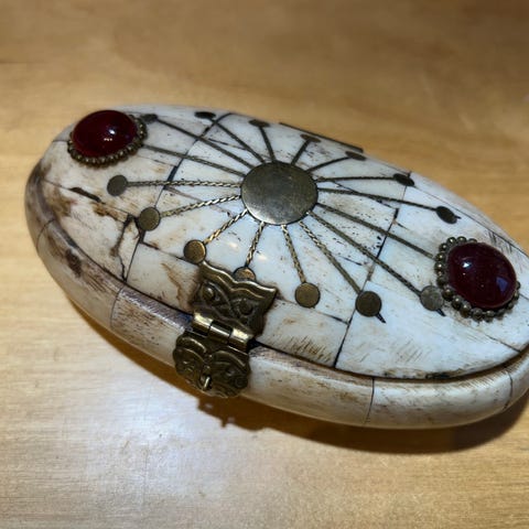Selger et svært gammelt smykke fra tidlig 1900 tallet. Arvet. Litt usikker på om det er bein eller elfenbein, men svært lett. Kan jo ikke være plast, da det er så gammelt. Porto kommer i tillegg.