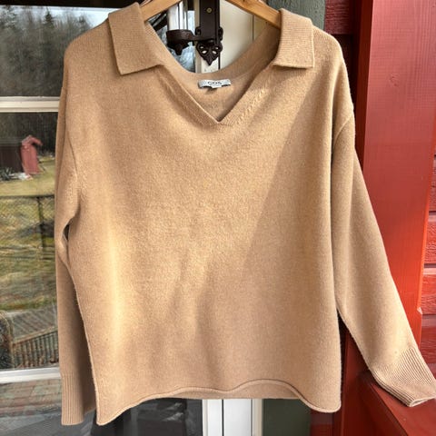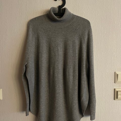 COS genser for dame i størrelse M. Genseren er gul og strikket i 100 % kasjmir. Den har rund hals, lange ermer og ribbestrikkede kanter. Perfekt til påske!