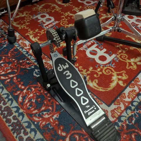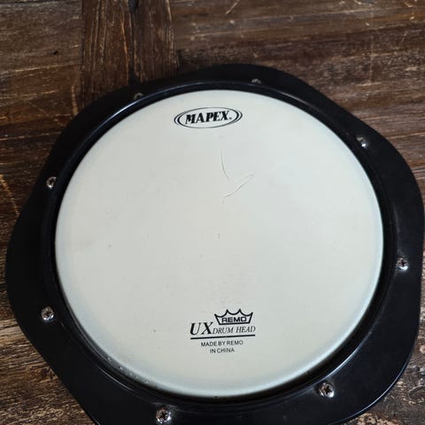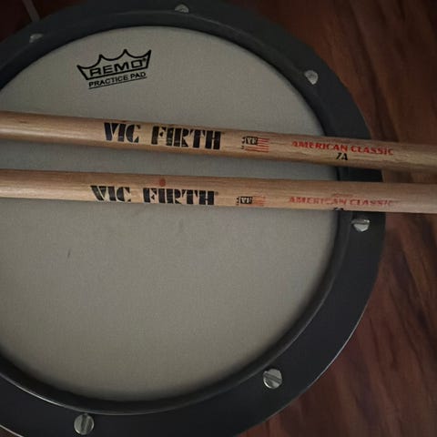 Øvepaden har hvit spilleflate og svart ramme, med gummiert underside for stabilitet mot underlaget. Nypris 400-500kr. Selger også godt brukt trommestikker i tre, men som fremdeles har mye bruk igjen.
