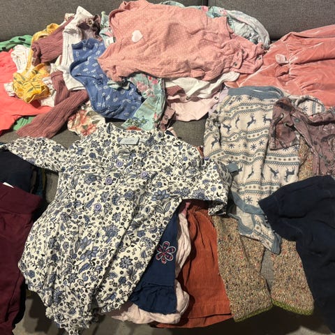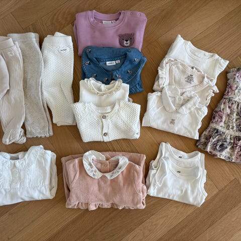 Meget stor klespakke med alt du trenger de første 6 måneder med baby(jente). Masse veldig lite brukt, noe nytt. Mange bodyer og bukser, pysjamaser, sokker, solhatter, antrekk, ulldresser mm. Anslår 60-80 plagg. Blant annet Petit Bateau, P.O.P., Hust and Claire, Name it osv.
