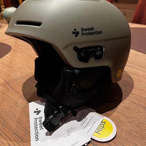 Sweet Protection skihjelm med MIPS-system i grå farge. Hjelmen har øreklaffer, ventilasjonsåpninger og feste bak for skibriller. Justerbar stropp under haken. Egnet til alpint og snowboardbruk.
