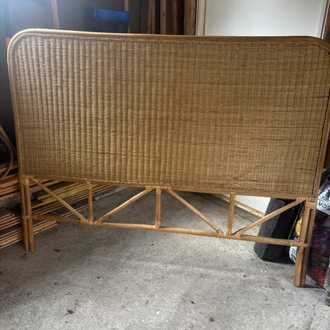 Isengegavl og nattbord i rotting, brunfarge. Sengegavlen har ramme i tre/bambus med flettet rottingfelt. Nattbordet har buet form med overflate og hylle i samme rottingstil. Passer til soverom der man ønsker et naturmateriale og et rolig uttrykk. Egnet for innendørs bruk.