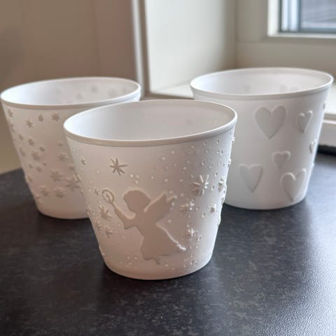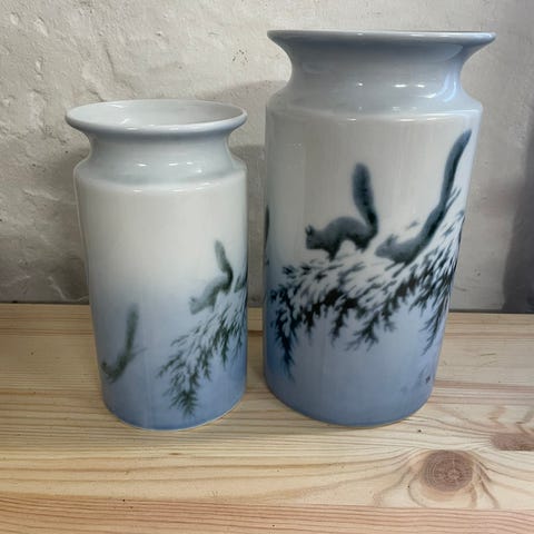 Porsgrund krus i hvit farge med preget dyremotiv. Det ene kruset har motiv av hjort, det andre har motiv av ugle og grener. Krusene har glatt innside og relieffdekor på utsiden. Egner seg som telysholdere.