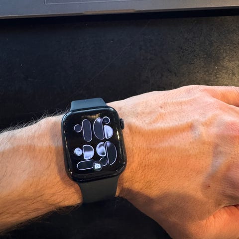 «Apple Watch series 9 45mm med GPS + Cellular (4G). Farge: «Starlight». Kjøpt i januar 2024. Følger med ladekabel. Fungerer som ved kjøp i januar 2024. Batteritid tilsvarer normal Apple Watch-bruk. Reimen har blitt noe misfarget av en genser (se bilder) - kan kjøpes ny. Brukt i hverdagen til trening.»