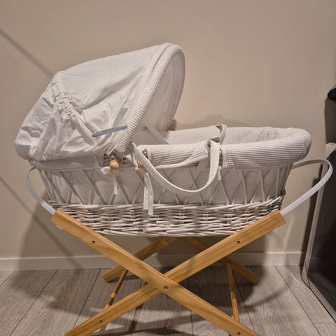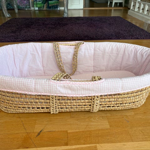 Pent brukt moseskurv til baby. Kurven er komfortabel og passer perfekt for nyfødte. Kurven har bærehåndtak. Følger med madrass og matchende tekstildekken (se bilder). En trygg og koselig løsning for den lille.