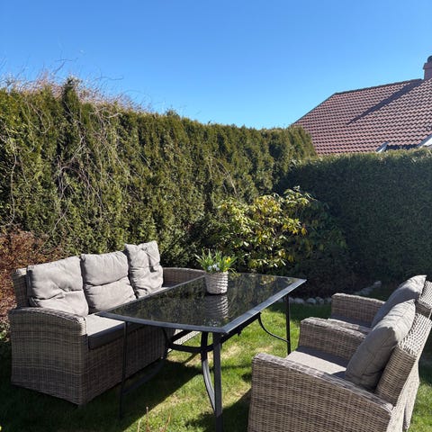 RESERVERT! Hjørnegruppe i værbestandig og slitesterk kunstrotting inkl puter. 3 deler. Svensk fabrikasjon Brafab, kjøpt på Home & Cottage, Sandefjord. En lengde inkl hjørne 230 cm. En lengde uten hjørne 140 cm. Br 78 cm. H 84 cm. Rektangulært bord med hylleplan og glassplate. L 112 cm Br 62 cm H 48 cm. Hele gruppen er pent brukt og inntakt. 2 av ryggputene har rift i stoffet på øvre kant. Man kan jo snu puten opp ned, da synes det ikke.