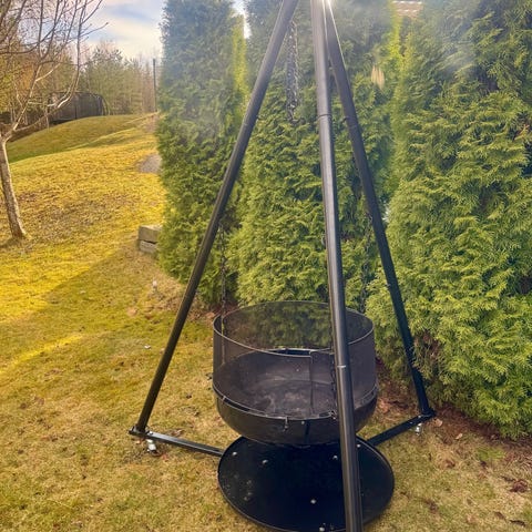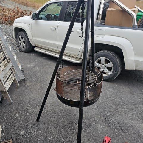 Bålpanne med tekk kjøp ny våren 2025 på Europris brukt 2 ganger platen på toppen har fått en liten bulk da den reiste på tur med vinden ingen ting å si for bruken kan sikkert lett slås litt på for å få rettet den ut