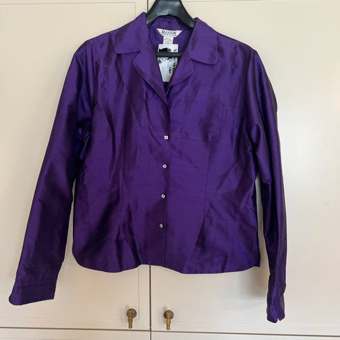 100% tynn silkeblazer/bluse i lilla. Mulig litt 80-talls? Ingen bruskskader.