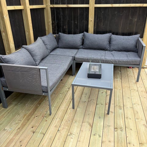 Hagesofa hjørnesofa med bord beige puter metallramme