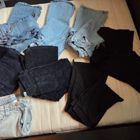 4 bukser str. 104. 1 helt ny og 1 med et par malingsflekker på benet. Den fra HM er slimflitt. De andre er relaxed fit. Ferdig pris.