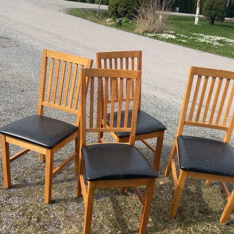 4 stoler kjøpt på bruktmarked gis bort. Ingen egentlige feil og mangler, men de bærer sin historie. De er ikke fra Ikea, men laget med flid for lenge siden og antagelig trukket om