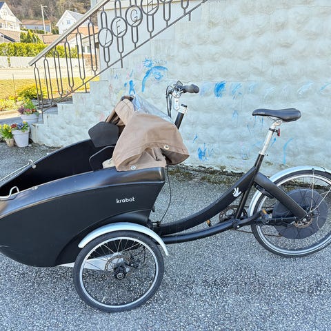 Sykkelen kan frakte opp til fire barn. Den har ikke blitt brukt i vinterhalvåret, og har alltid stått under tak mellom turer.