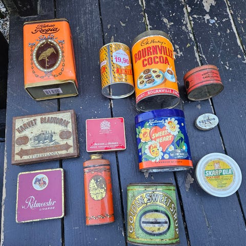 Vintage reklamebokser / blikkbokser fra kolonialvarer, tobakk og pastiller selges.