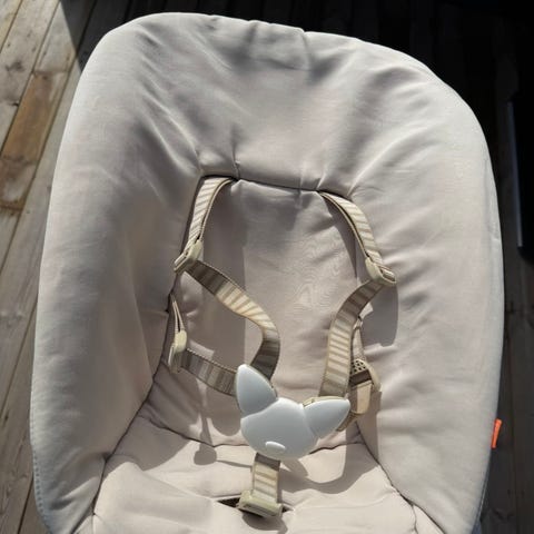 (følger med ekstra trekk), lekebøyle, seler, bøyle, ryggstøtte, pute og støtteben selges.