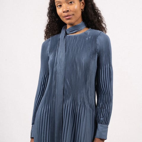 Kjolen har plisséstruktur i stoffet og korte ermer. Rund hals og ledig passform gir et behagelig uttrykk. Lengden går til omtrent over kneet, avhengig av høyde. Egnet til bruk på varme dager eller til hverdags og enkle anledninger.