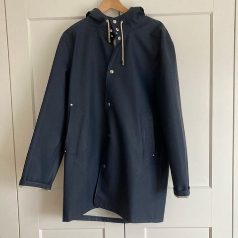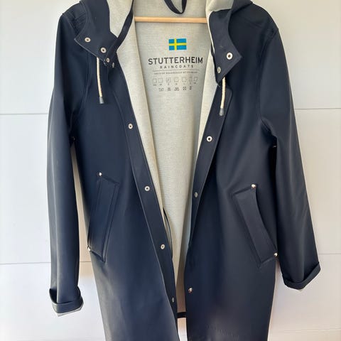 Stutterheim regnjakke for herre i størrelse S. Jakken er svart og laget i polyester med glatt, vannavvisende overflate. Modellen har hette med snøring, trykknapper i front og skrålommer i sidene. Lengden går ned mot låret for ekstra dekning mot regn. Passer som ytterjakke i vått vær og til hverdagsbruk utendørs.