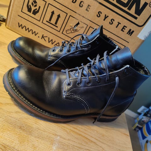 Nedstøvet men helt ubrukte Wolverine 1000 Mile sko. Ble bestilt over nett fra USA, men viste seg å være for store. Skoene har størrelse 8, men de fremstår meget store. Trolig størrelse 43. Farge sort. For mer informasjon om modellen: https://www.wolverine.com/US/en/1000-mile-plain-toe-original-boot/17967M.html?dwvar_17967M_color=W05300#