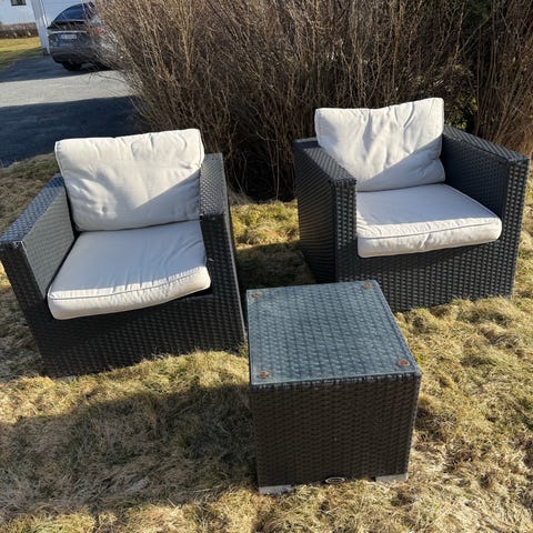 To hagestoler i kunstrotting i mørk farge. Stolene har avrundet rygg og armlener, og leveres med lyse sitteputer. Egnet til bruk på terrasse, balkong eller i hage. Materiale er vedlikeholdsvennlig kunstrotting med metallben.
