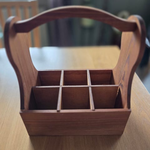 Selger en fin gammel beholder beregnet til oppbevaring av teposer. Beholderen har håndtak og en fin blå farge, tremateriale.