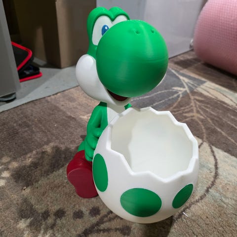 Nintendo Yoshi figur med egg i grønn og hvit farge. Figuren forestiller karakteren Yoshi som holder et stort egg med grønne prikker. Laget i hard plast med malte detaljer i grønt, hvitt, rødt, oransje og blått. Egnet som samlerfigur, dekorasjon eller leke for barn som liker Nintendo-universet og Super Mario-figurene. Størrelse og produsentår er ikke oppgitt.