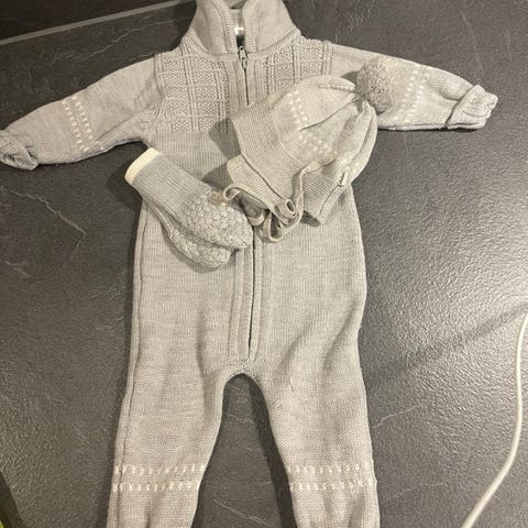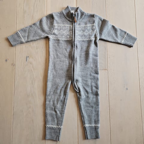 Tykkere beige ulldress med krage og glidelås foran. Ermer og ben kan brettes ned når baby vokser, noe som forlenger brukstiden betraktelig. 100% merinoull. Vaskes i maskin på 40° C ullprogram. Pent og lite brukt, men en bitteliten løs tråd (se bilde).