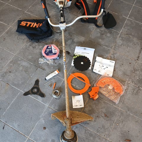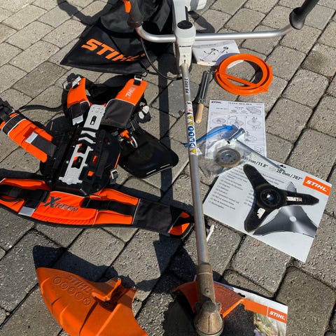 Fint brukt Stihl ryddesag med trådspole, trekant kniv og sagblad selges.