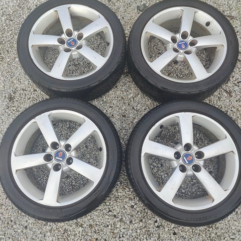 Selger ett sett med saab original aerofelg med bra sommerdekk. Ca. 5mm mønsterdybde.