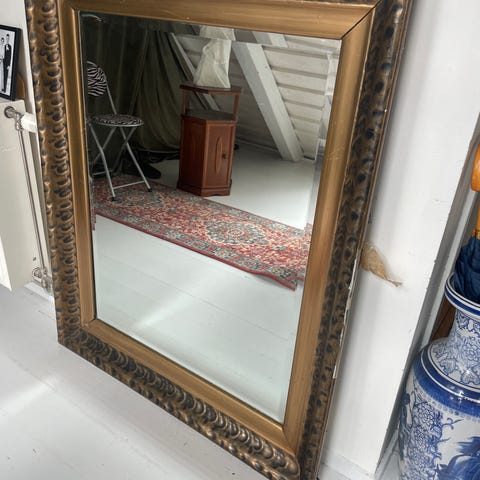 Selger et stort og flott speil med dekorativ gullramme. Dette er et skikkelig blikkfang som passer perfekt i stue, gang eller soverom.