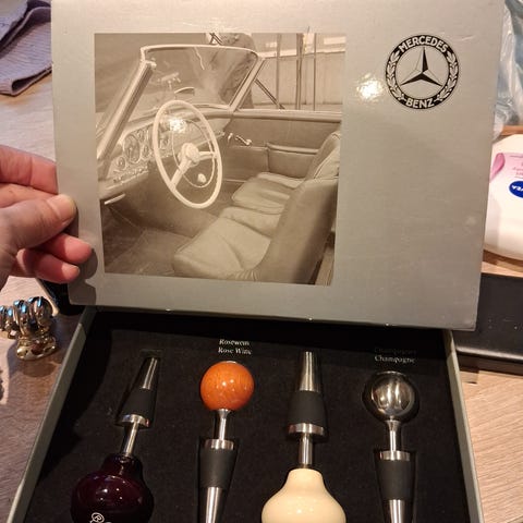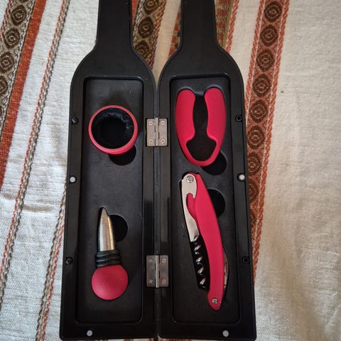 Piper Heidsieck vinsett bestående av en rød veske med preget flaske- og glassmotiv på utsiden. Innsiden er formstøpt med plass til én flaske og to champagneglass. Settet inkluderer to vinglass med Piper Heidsieck-logo. Vesken har bærehåndtak og glidelåslukking, og er egnet for oppbevaring og transport av vin- eller champagneflaske med tilhørende glass.