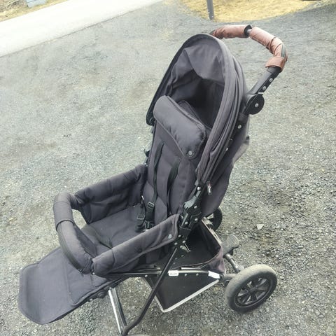 Barnevogn brukt av merket 4ME med regntrekk og kurv innunder.