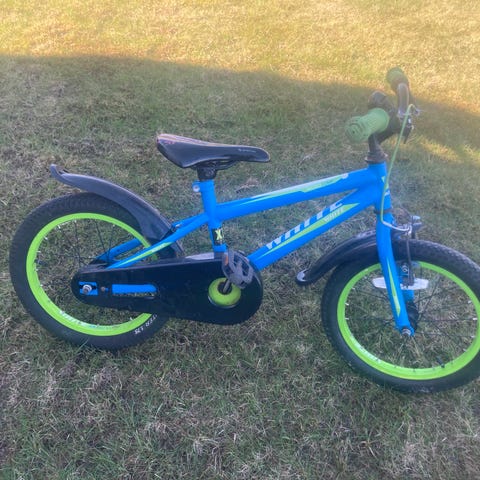 White barnesykkel 16" i blå farge med grønne detaljer.