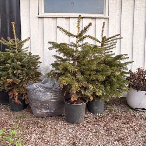 Ukjent merke granbusker i tretønner utendørsplanter grønn