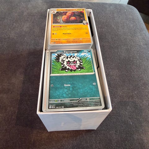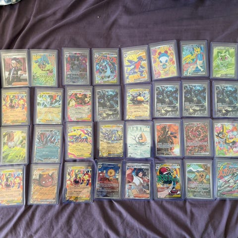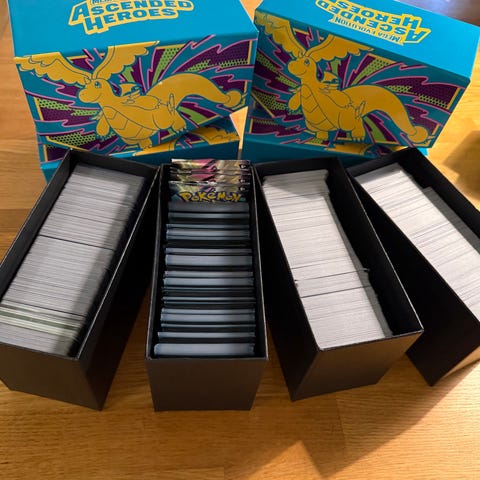 Ca. 5,6 kg med kort fra Ascended Heroes. Inneholder også reverse (Energy, pokeballs), holo og noen ex. ETB i midten venstre består av kun holo/reverse.