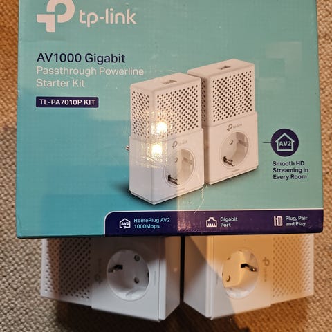 TP-Link nettverksadapter sett i hvit farge. Består av to enheter som plugges direkte i stikkontakten. Enhetene har Ethernet-port for tilkobling av nettverkskabel. Egnet for å utvide kablet nettverk mellom rom ved hjelp av strømnettet i boligen, for eksempel til PC, TV, spillkonsoll eller andre enheter med nettverksport.