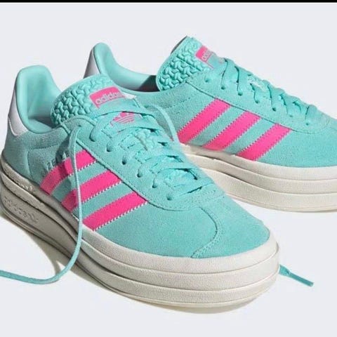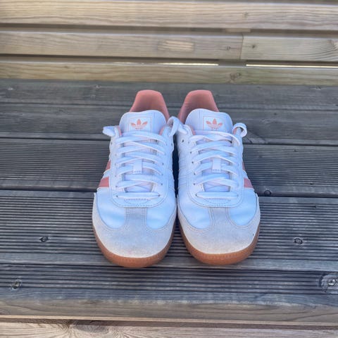 Adidas sneakers i størrelse stor 40. Skoene er rosa med mørke striper på sidene og lys gummisåle. Overdelen er semsket materiale med snøring.