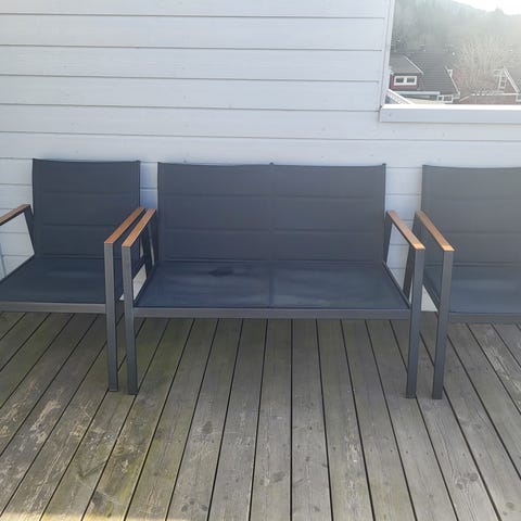 Hagemøbler stoler, fotskamler og bord, kan selges separat eller samlet.