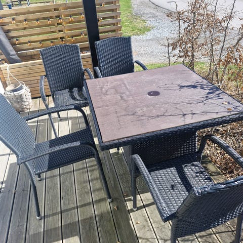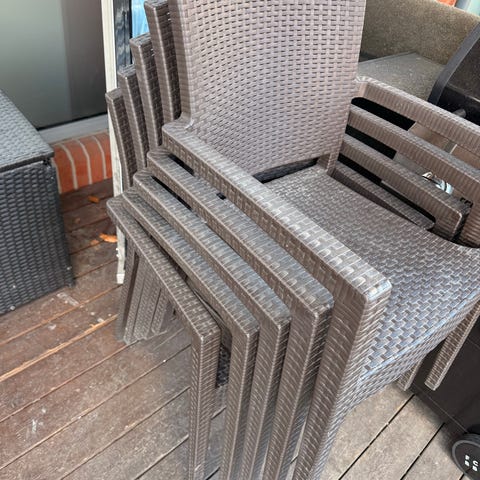 4 svarte rottingstoler på stålramme, med 4 fotskamler og ett lite bord. Kan selges for 500kr samlet. Kan diskuteres ved rask avgjørelse😊