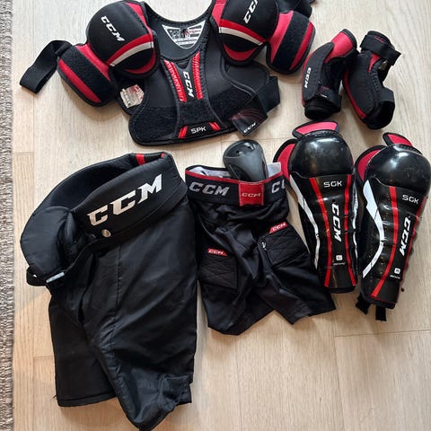 Bauer Youth ishockeybukse og CCM barnebeskyttelse for ishockey. Settet består av Bauer Youth ishockeybukse i svart og CCM legg- og albuebeskyttere i rød, svart og hvit. Beskyttelsene har harde ytterskall kombinert med polstret innside og justerbare stropper for tilpasning. Utstyrt for å gi grunnleggende beskyttelse til barn ved ishockeytrening og kamp på is.