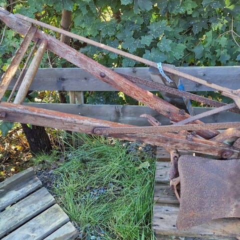 Gammel slede gis bort. Den har de siste årene vært pyntet med blomster. Den må hentes på henger, veier ganske mye
