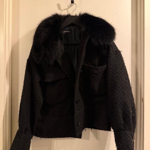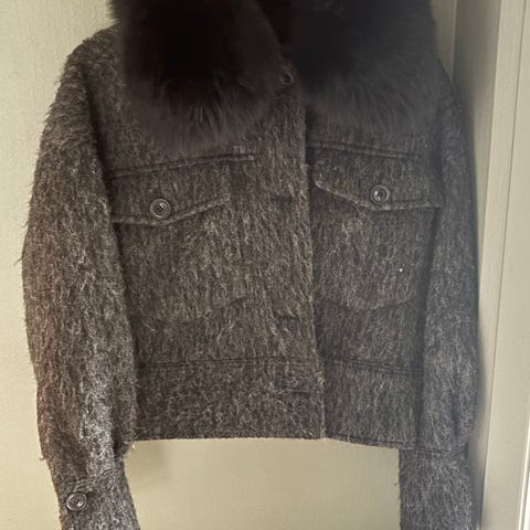 Meotine jakke for dame i størrelse XS./SJakken er svart og laget i ullmateriale med teksturert overflate. Den har stor krage, knappelukking i front og to lommer med klaff. Pelskrage som er avtagbar.