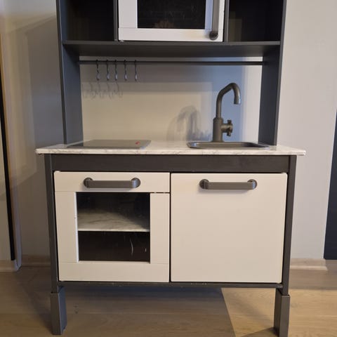 IKEA lekekjøkken i frittstående modell med over- og underskap. Kjøkkenet har kokeplate, vask med kran, mikroboksdel og åpne hyller til oppbevaring. Frontene er i lys grønn tone, mens benkeplaten har marmoraktig overflate (kontakt plast). Det følger med en plastkasse med variert lekemat og kjøkkenredskaper, som passer til rollelek på kjøkkenet. Egnet for barn som liker å leke matlaging og kjøkkenlek.