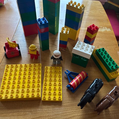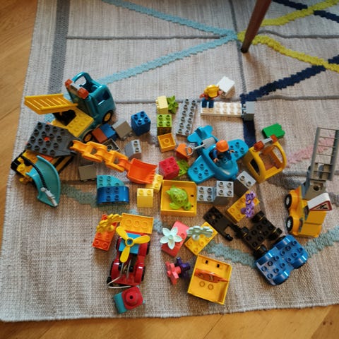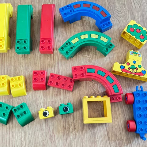 Ulike klosser i forskjellige farger, ambulanse, traktor, en gul plate og ulike figurer, hello kitty og ole brumm!